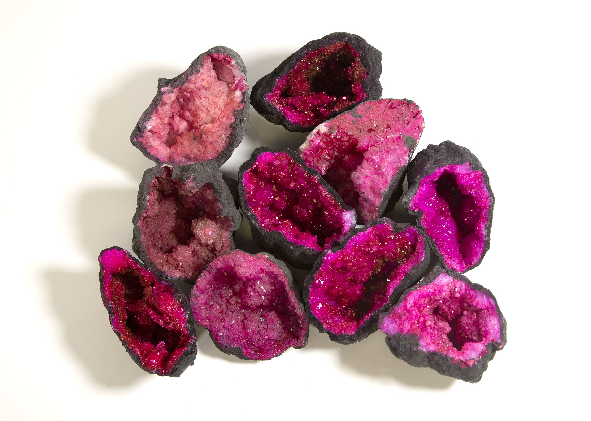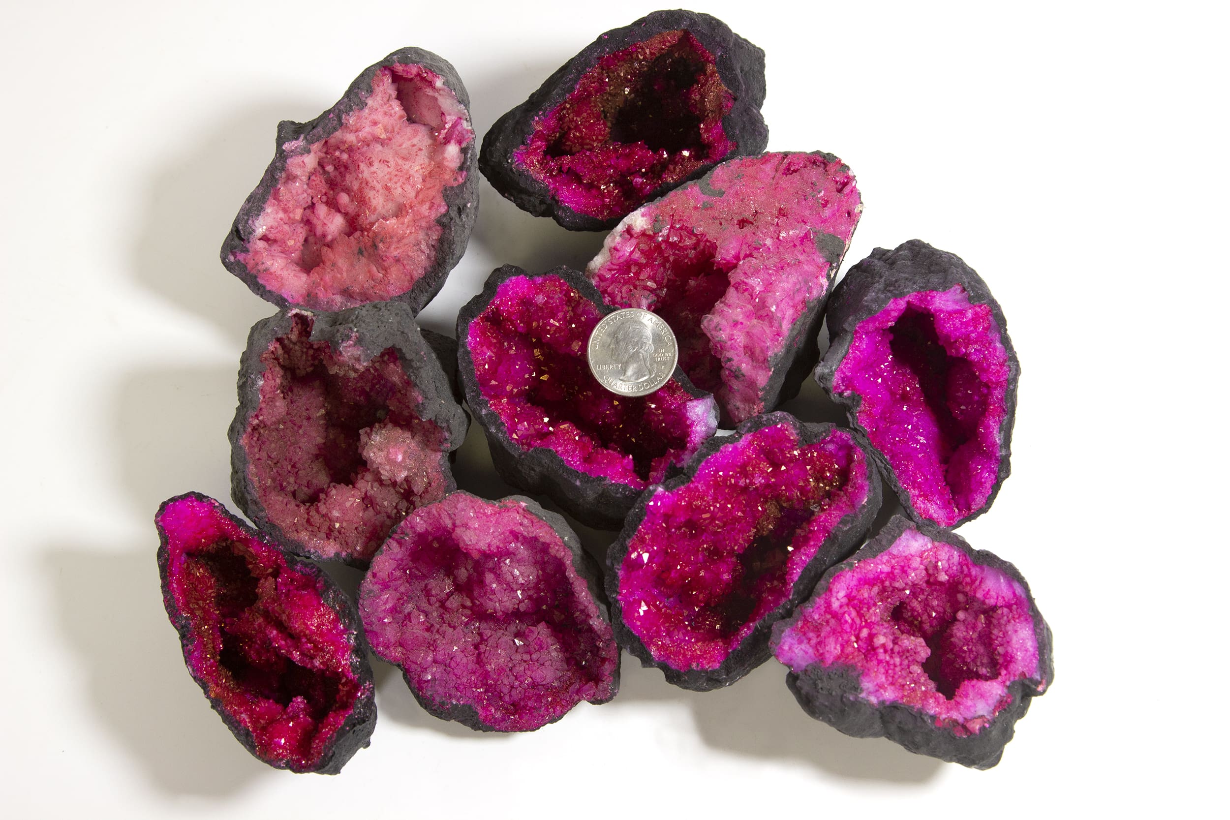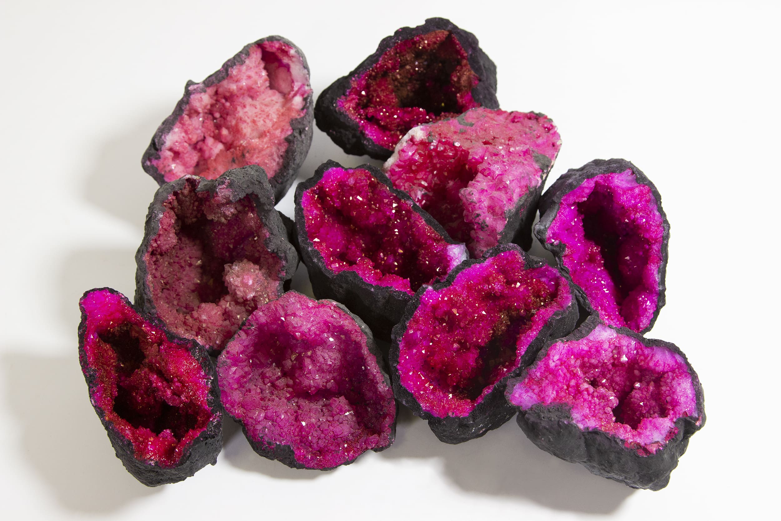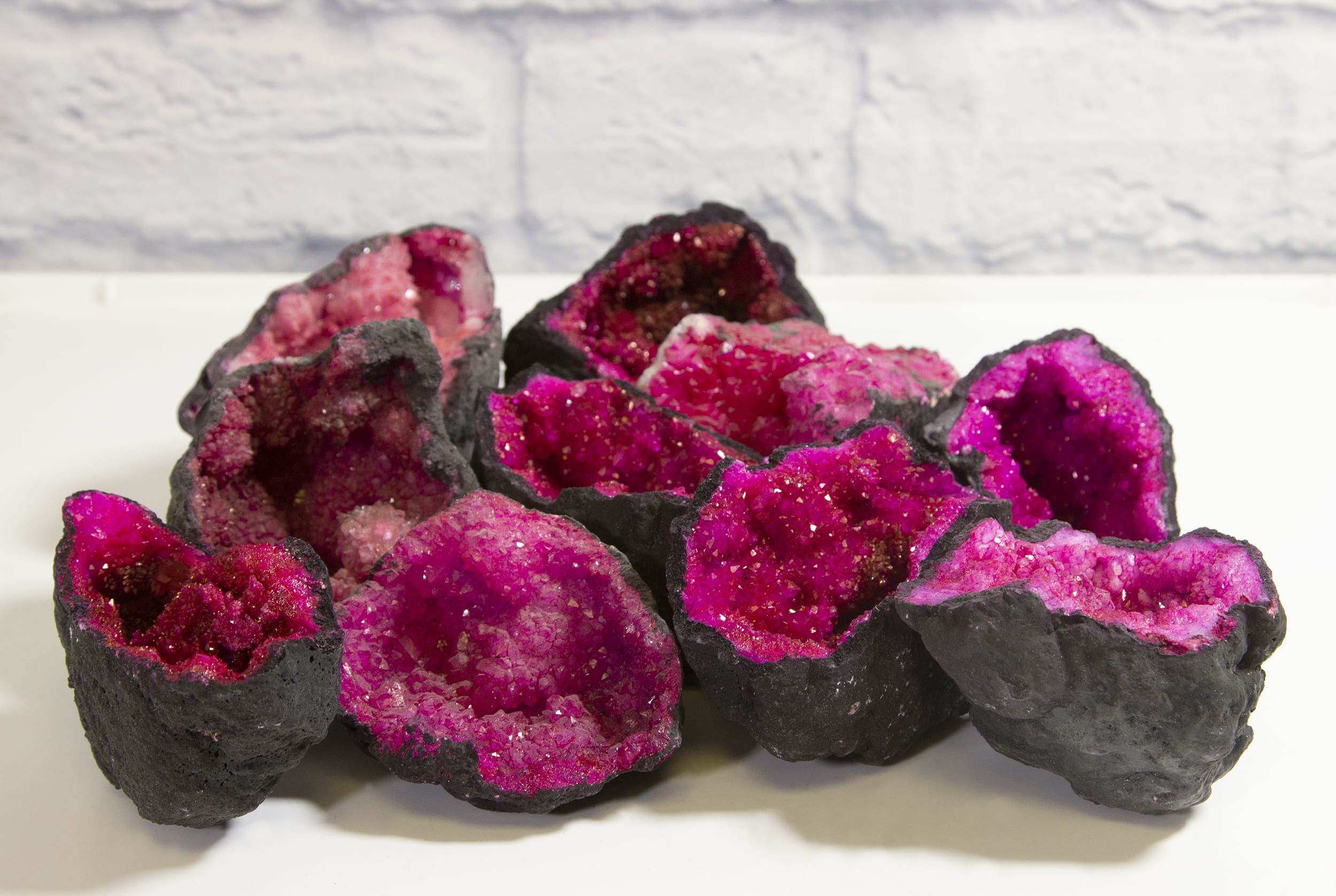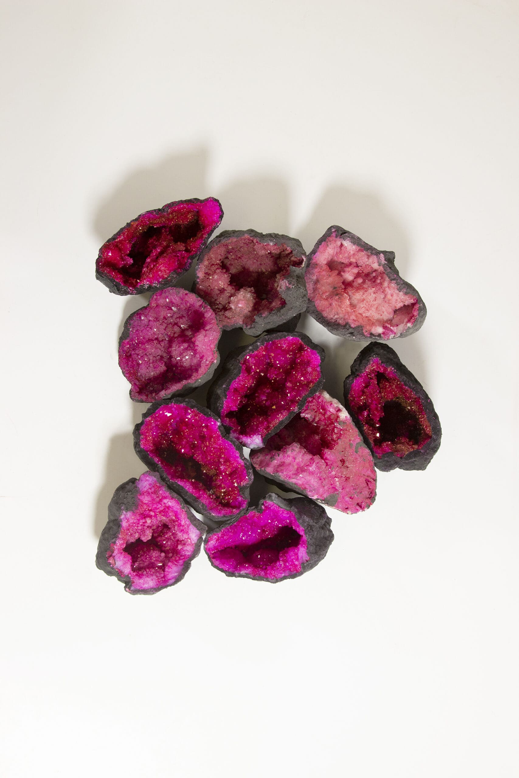 These gorgeous dyed pink geode halves are 3-4″ and weigh .30-.66 lbs. Buy ONE geode half in this brilliant pink color. Each geode half will vary in shape, size, color, and overall look as they are a naturally formed material. Each geode half will be a stunning dyed bright pink color.