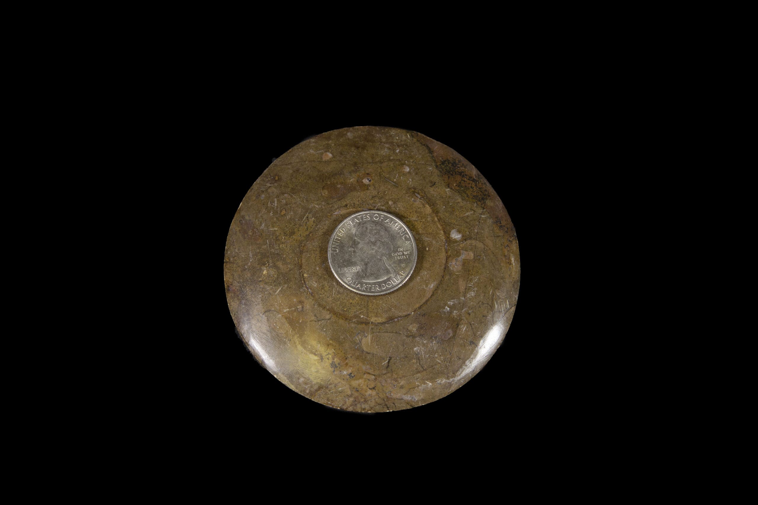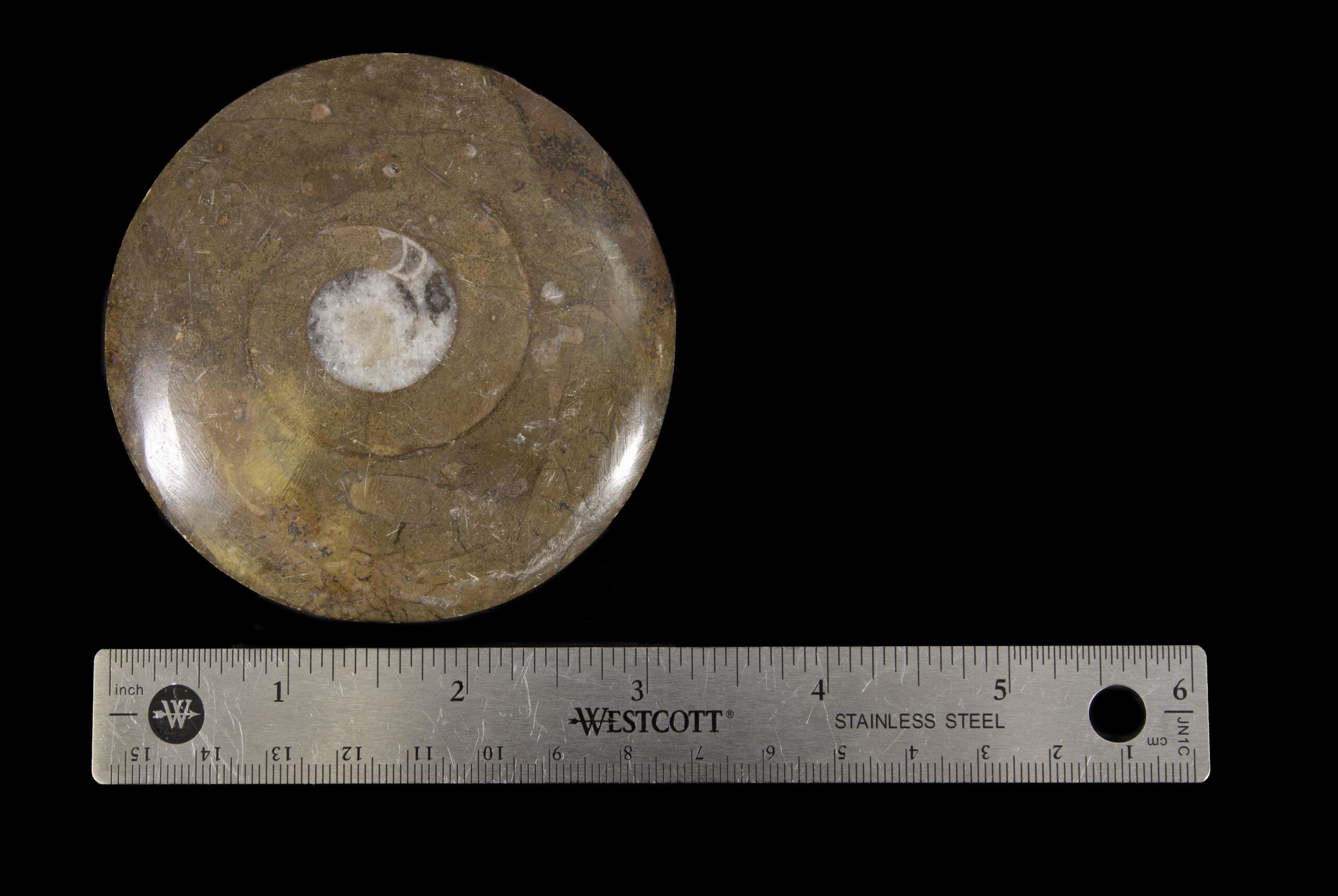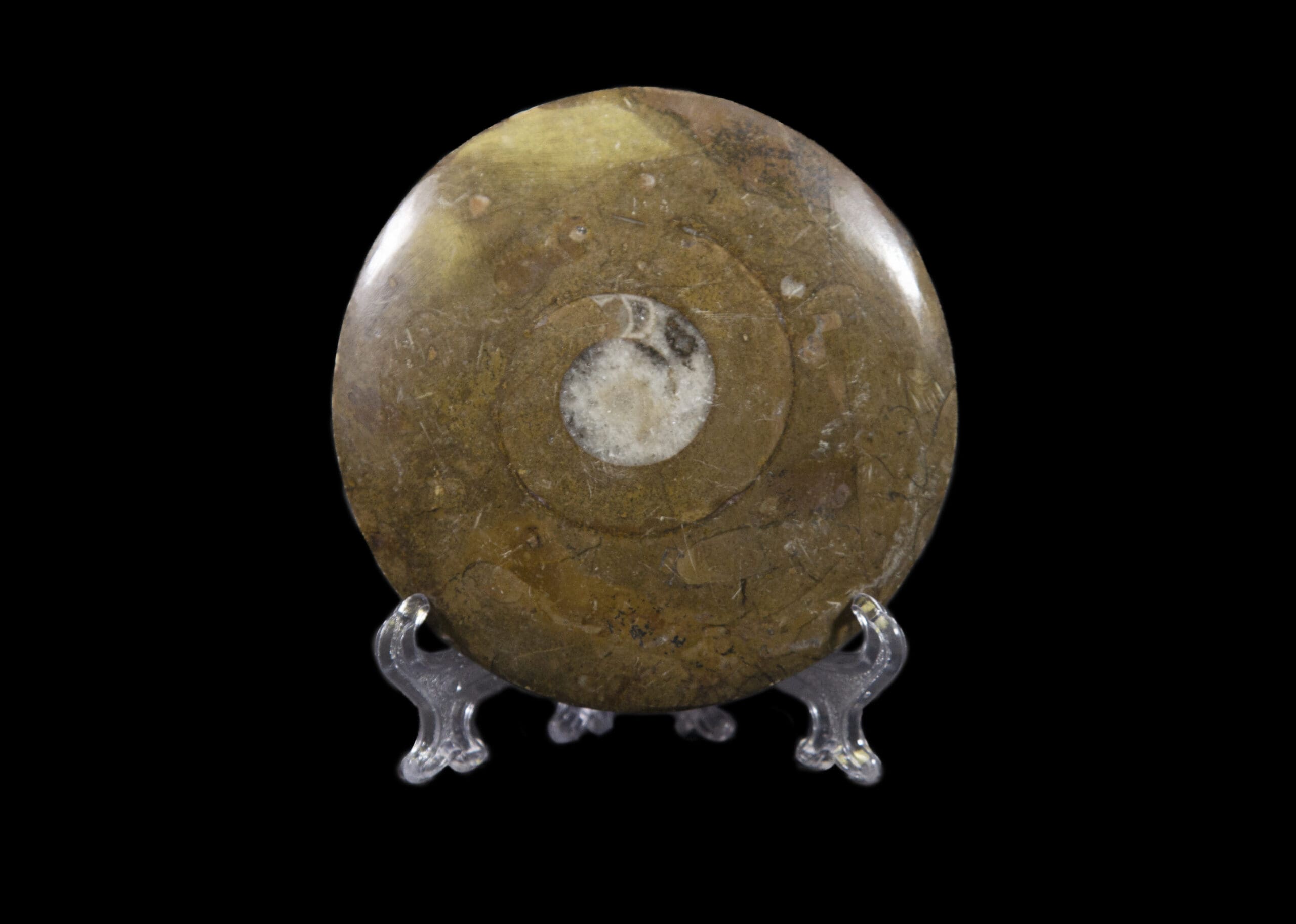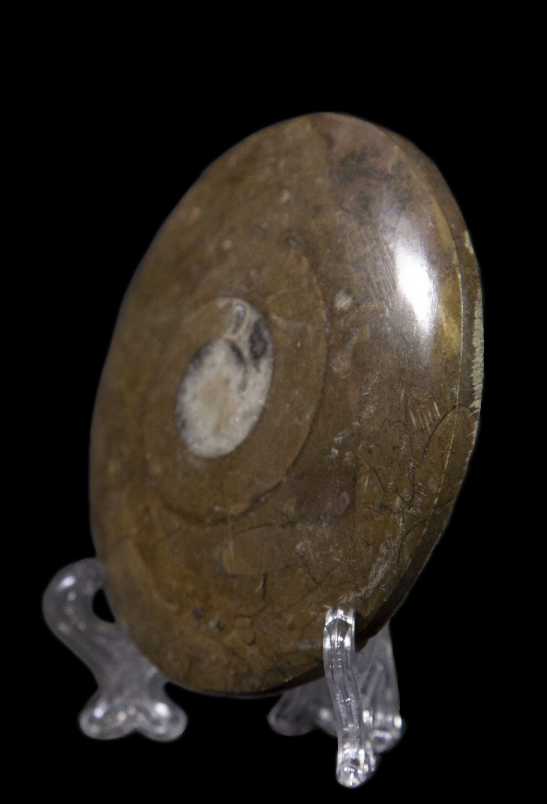 This unique disk is made from brown Ammonite. Ammonite is an extinct shelled cephalopod that died out around 66 million years ago. These disks will all vary in size, shape, and coloring, as they are made from a naturally formed material. Each disk will measure 3″ roughly and weigh under 1/5 lb. This disk can be displayed on a stand like pictured, or placed flat on a coffee table book stack or desk corner.