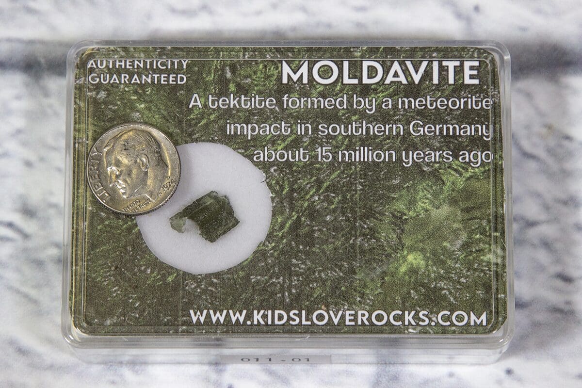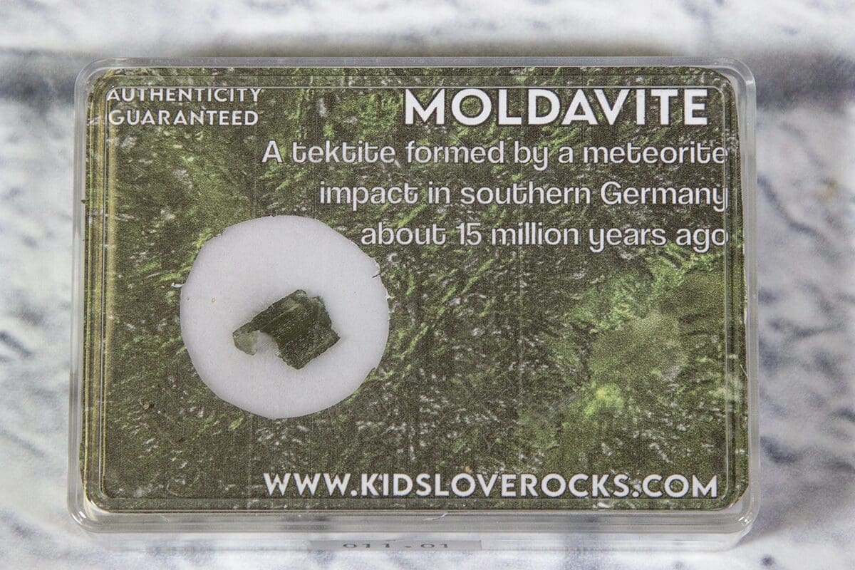 Moldavite in a protective plastic case.