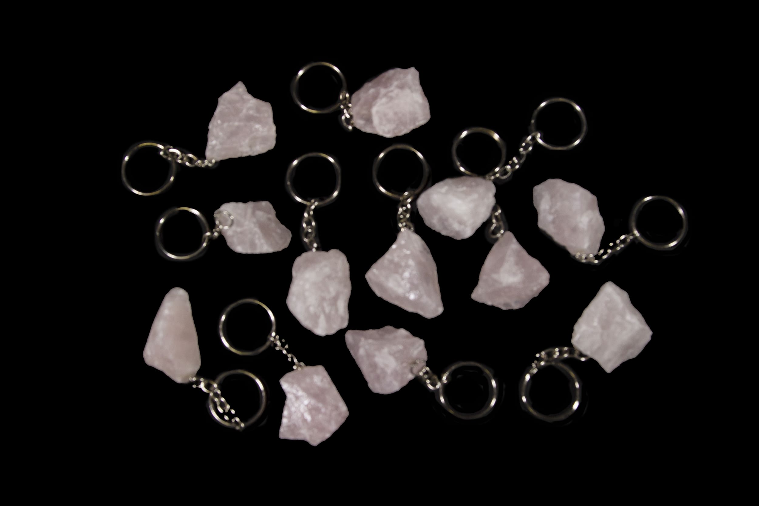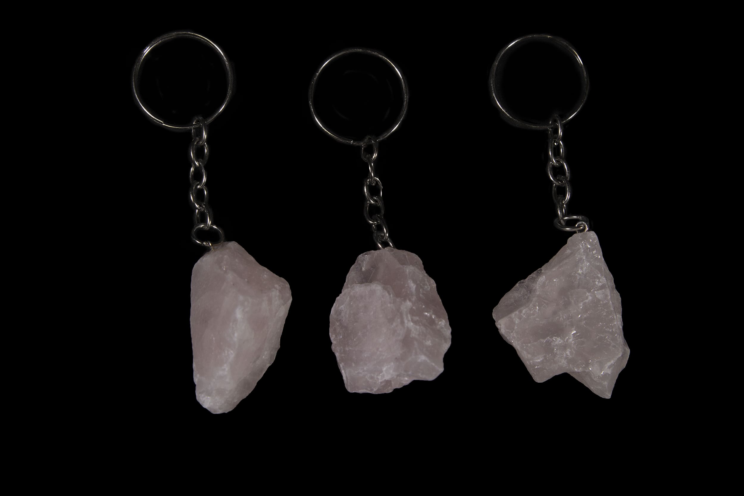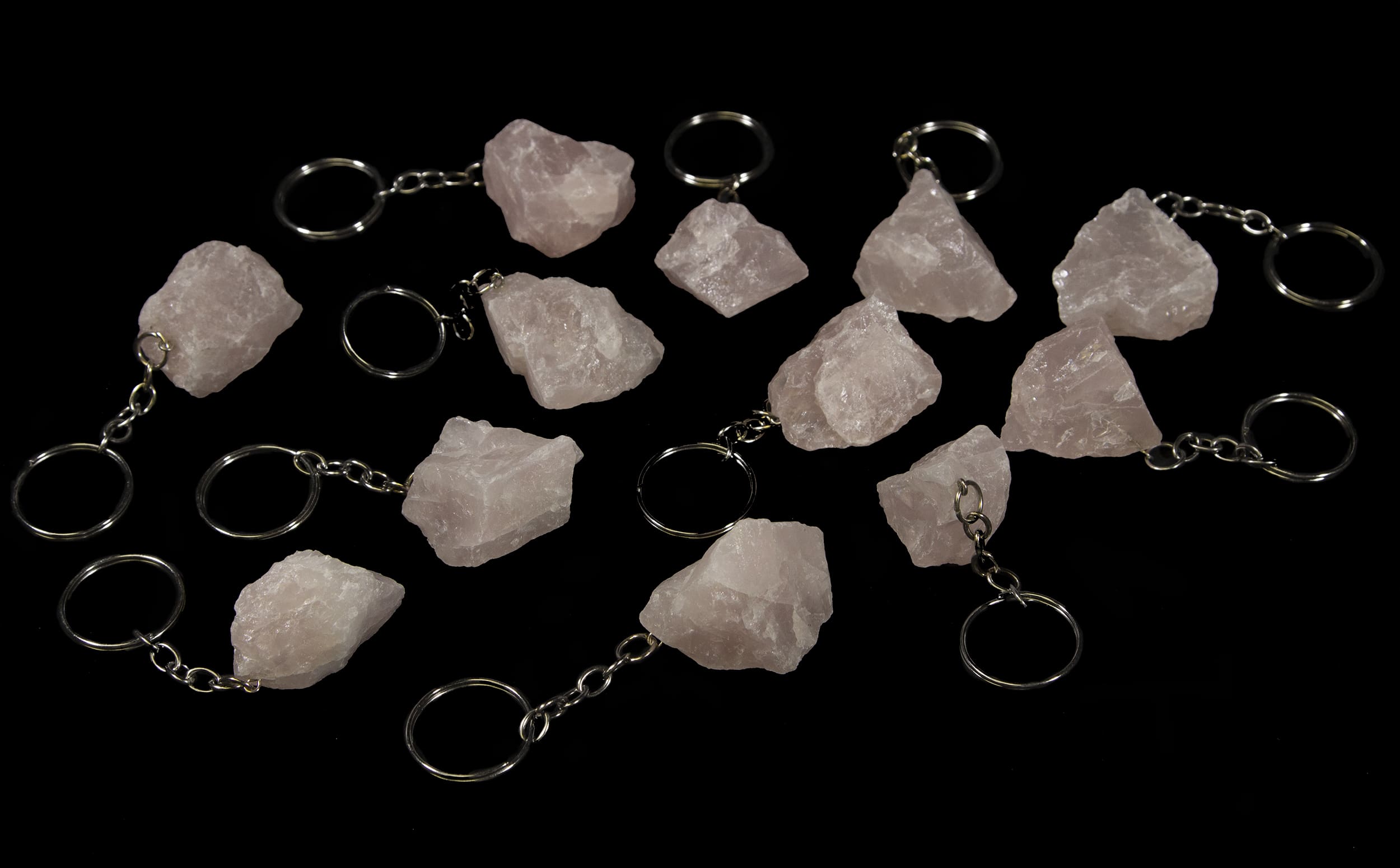 These keychains have a 1-1.5″ rough rose quartz on the end.