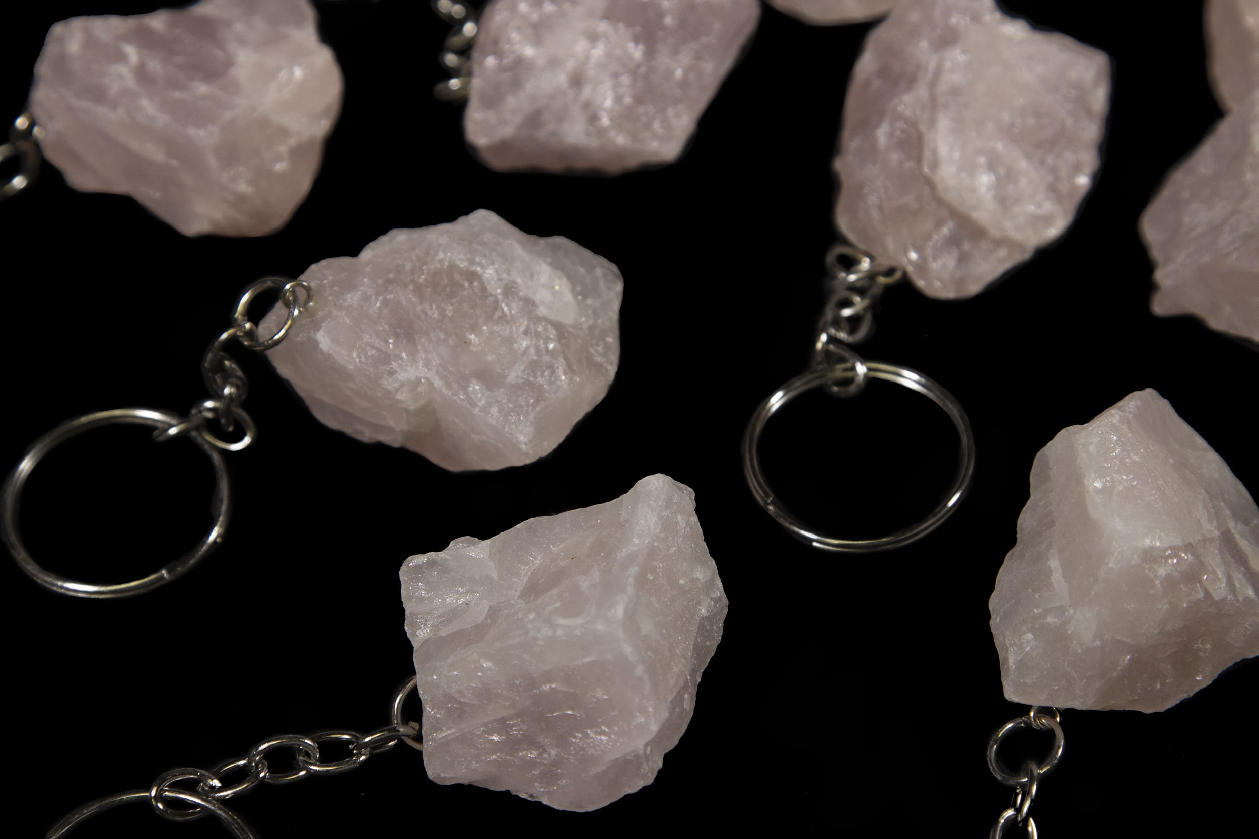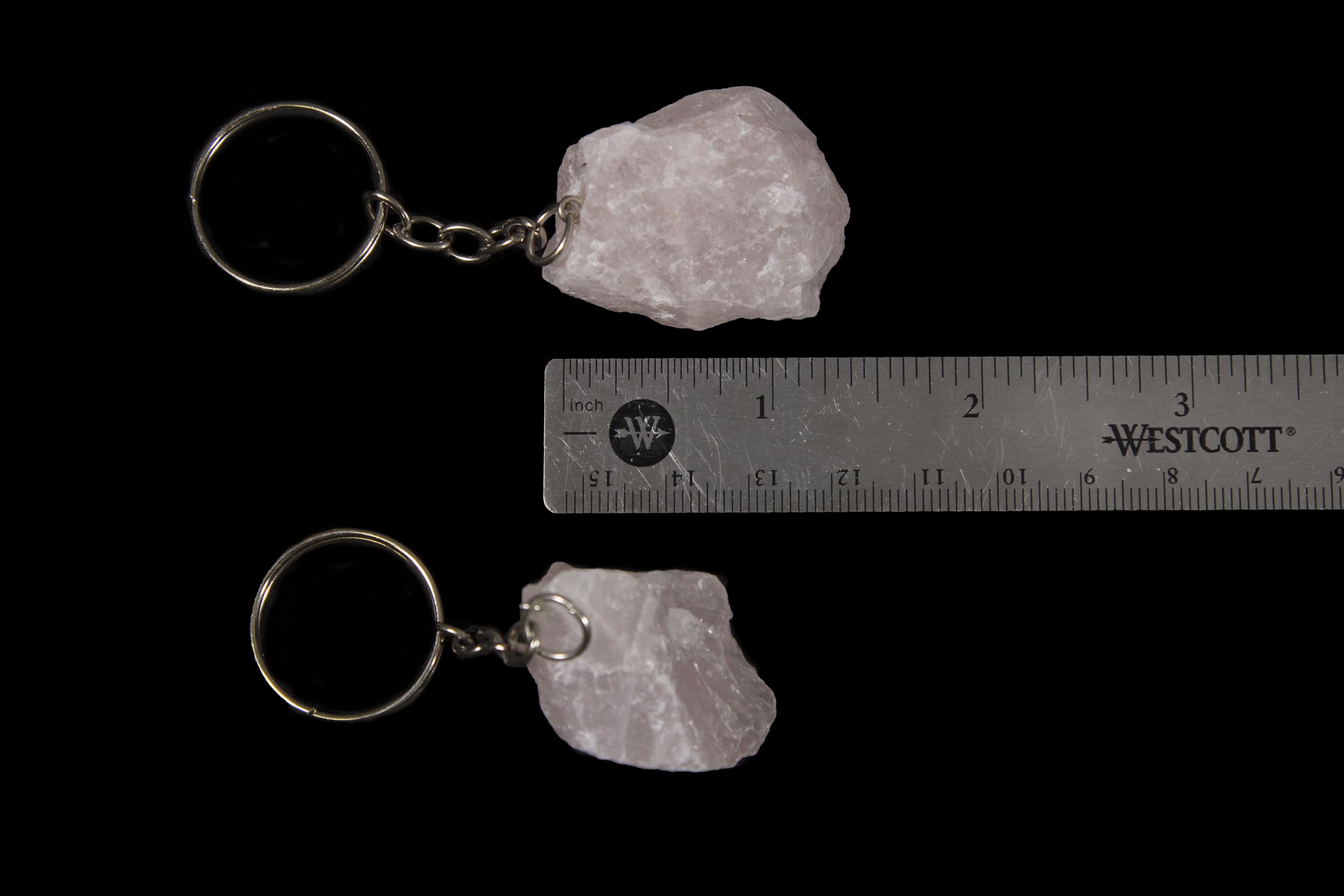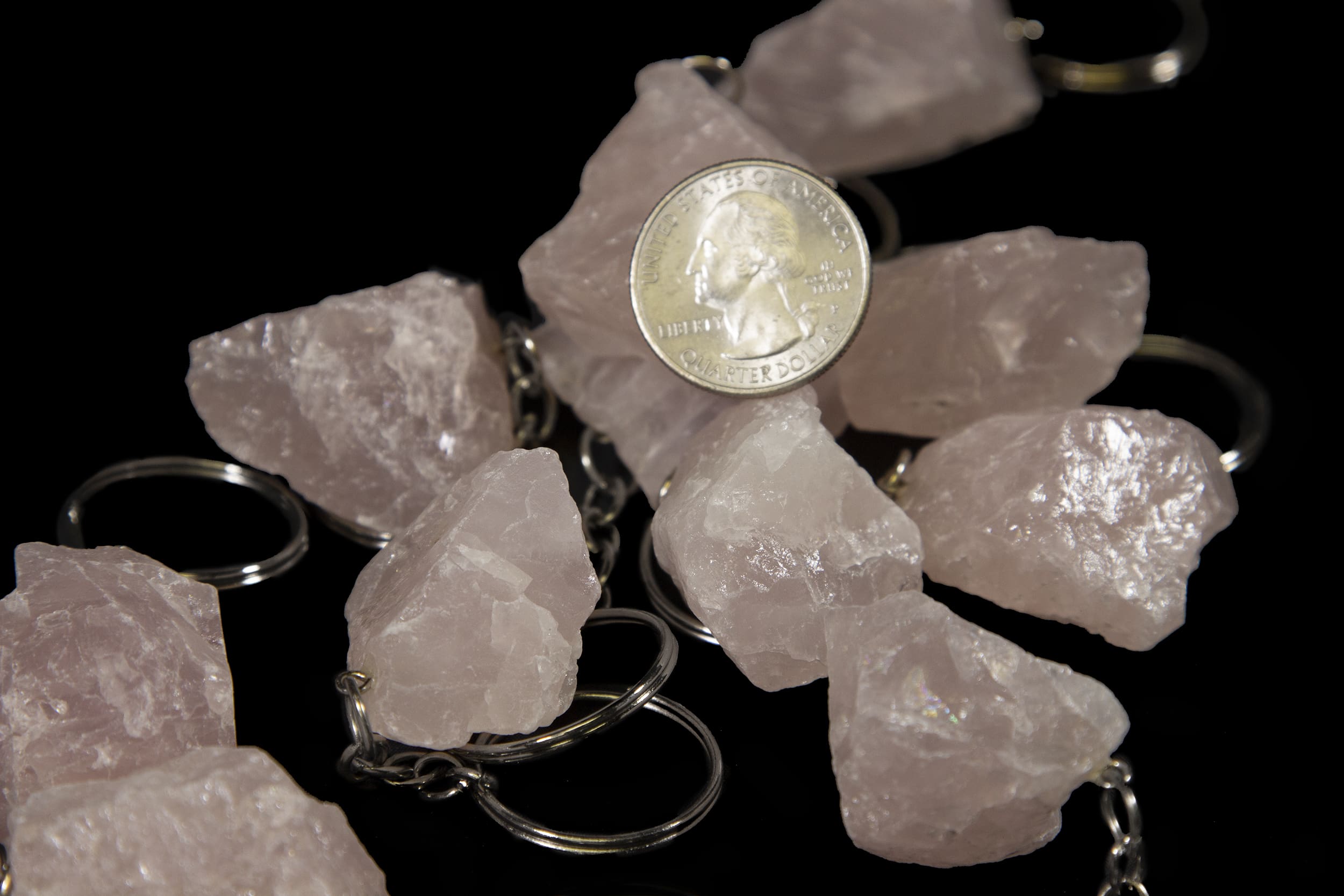 These keychains have a 1-1.5″ rough rose quartz on the end.