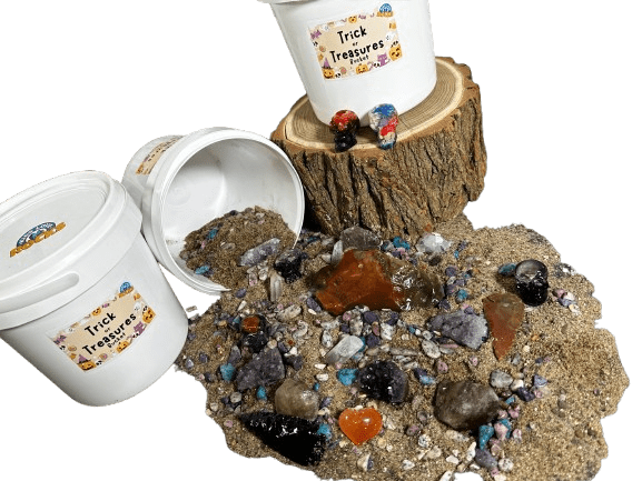 Dig into spooky fun with the Trick or Treasures bucket! Each bucket is packed with real gemstones and minerals waiting to be discovered. Kids and collectors alike will love sifting through the sand to uncover a dazzling mix of colorful treasures.